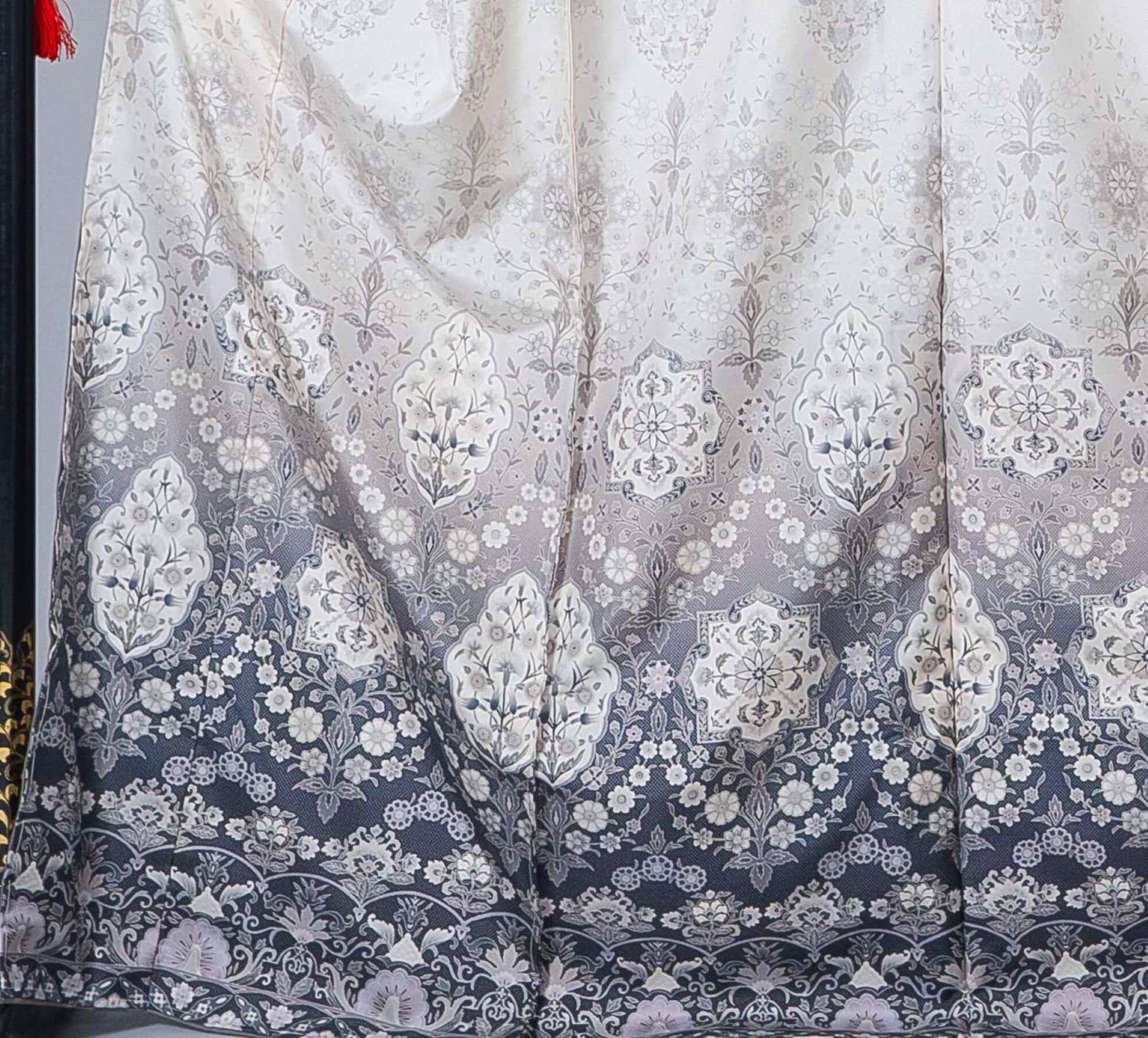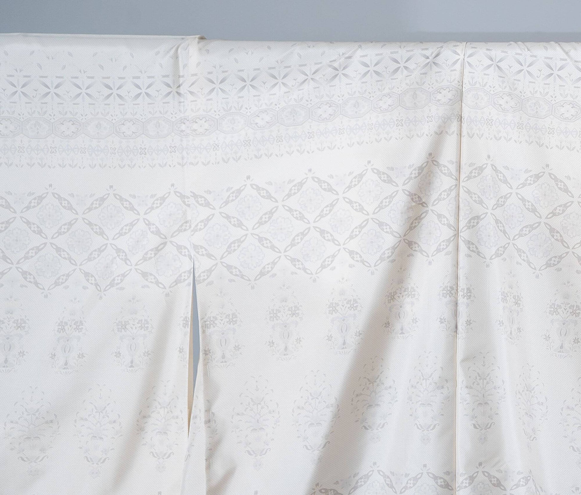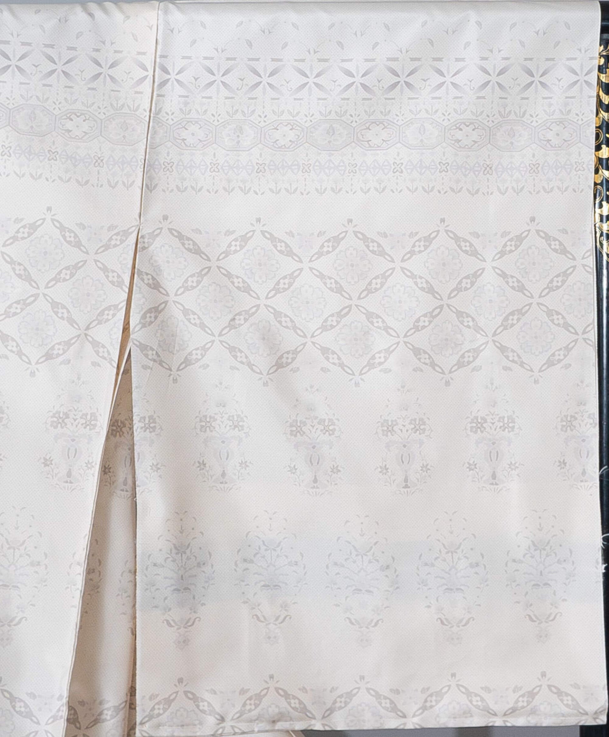 白地の大島紬に上半分には円満や調和を意味する「七宝」や繁栄の願いを込めた「八角形」などの文様が規則正しくは配列されており、裾にはエキゾチックな更紗文様に黒のボカシ。モノトーンカラーがモダンな印象の装いになります。